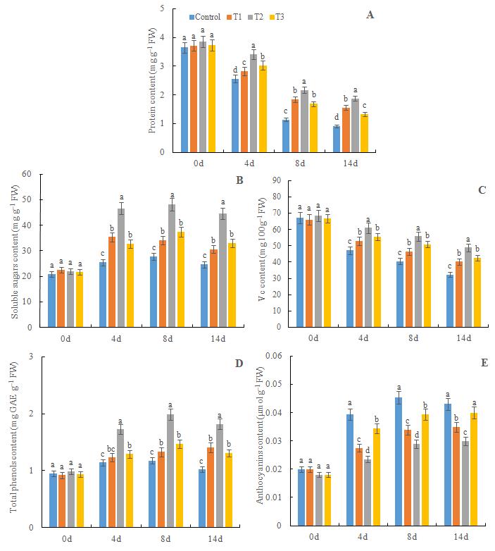 | 图2 冷藏条件下聚谷氨酸对草莓果实蛋白质含量(A)、可溶性糖含量(B)、Vc含量(C)、总酚含量(D)和花色素苷含量(E)的影响。 |