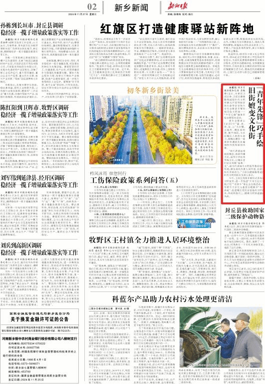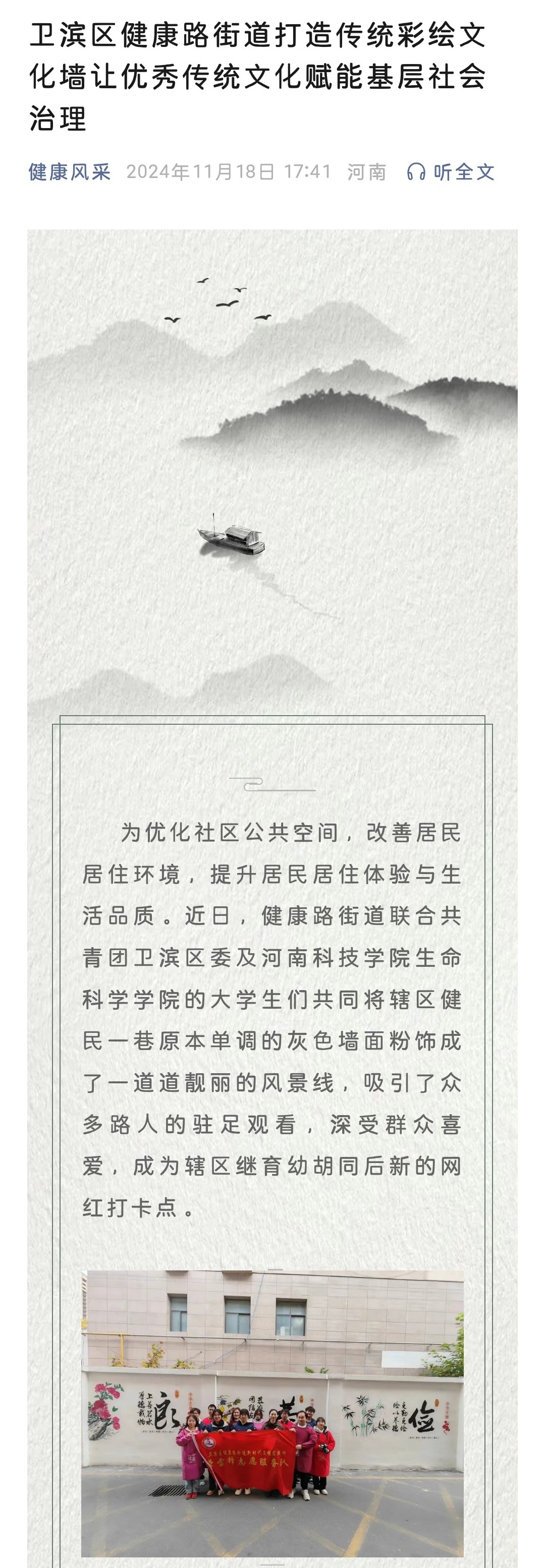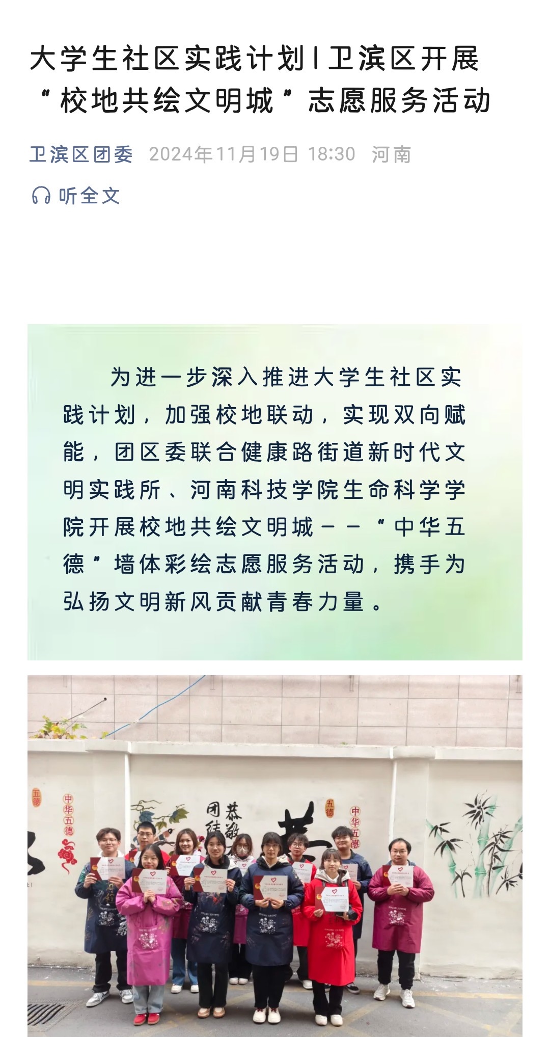 11月16日至17日,91国产 “绘绿水青山,筑环保意识”实践团携手91国产 青年志愿者联合会,在河南省新乡市卫滨区人民政府旁举办了一场别开生面的“涂美社区,绘梦先锋”墙绘活动。新乡日报、卫滨区团委等媒体和公众号平台对该活动进行报道。