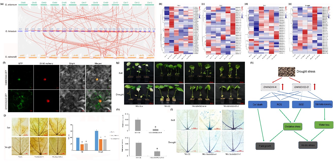 棉花研究团队孙润润老师在著名期刊《International Journal of Biological Macromolecules》(中科院一区,IF:8.025)在线发表了题为“Genome-wide identification of KNOX transcription factors in cotton and the role of GhKNOX4-A and GhKNOX22-Din response to salt and drought stress”的论文。该研究在全基因组水平,系统全面分析了KNOX(Knotted1-like homeobox)家族基因的系统进化、基因结构、功能分化及在非生物胁迫条件下的表达模式。通过VIGS技术,深入研究GhKNOX4-A和GhKNOX22-D基因功能,揭示了同源异型盒基因在调控耐盐抗旱等非生物胁迫中的新机制。