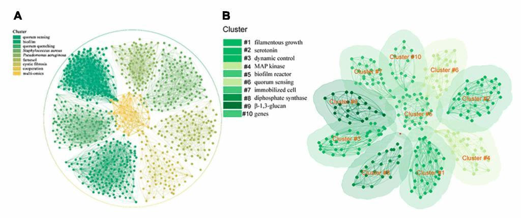 | 图1 (A)微生物群体效应研究热点;(B)酿酒酵母群体效应研究热点 |