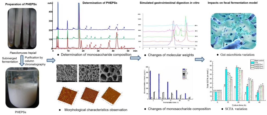 该论文通过分离纯化、谱学方法、扫描电镜和原子力显微镜观察等手段对不同胞外多糖组分加以表征,并通过体外模拟胃肠消化过程,系统比较了蝙蝠蛾拟青霉胞外多糖与常见益生元组分低聚果糖(FOS)的代谢和益生效果差异。结果表明,蝙蝠蛾拟青霉胞外多糖可以有效抵御人工胃液和小肠液的消化作用,能够有效促进双歧杆菌和乳酸菌等益生菌的增殖和多种短链脂肪酸的产生。该研究为新型长效益生元组分的开发提供了理论基础,该研究得到了中国博士后基金和河南省科技攻关项目的资助。