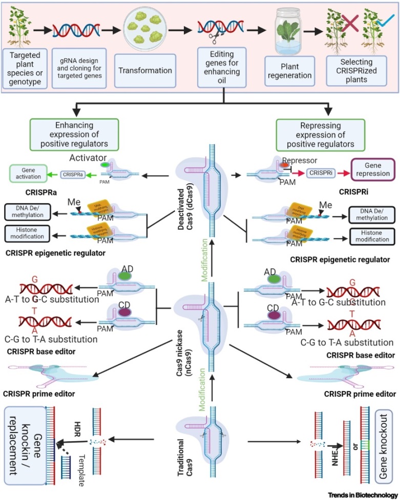 | 图 1. 多种 CRISPR 基因组编辑器用于编辑与油脂生物合成和积累相关的基因以提高植物的油脂含量和质量 |