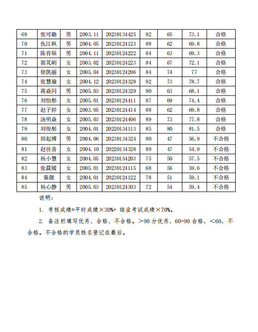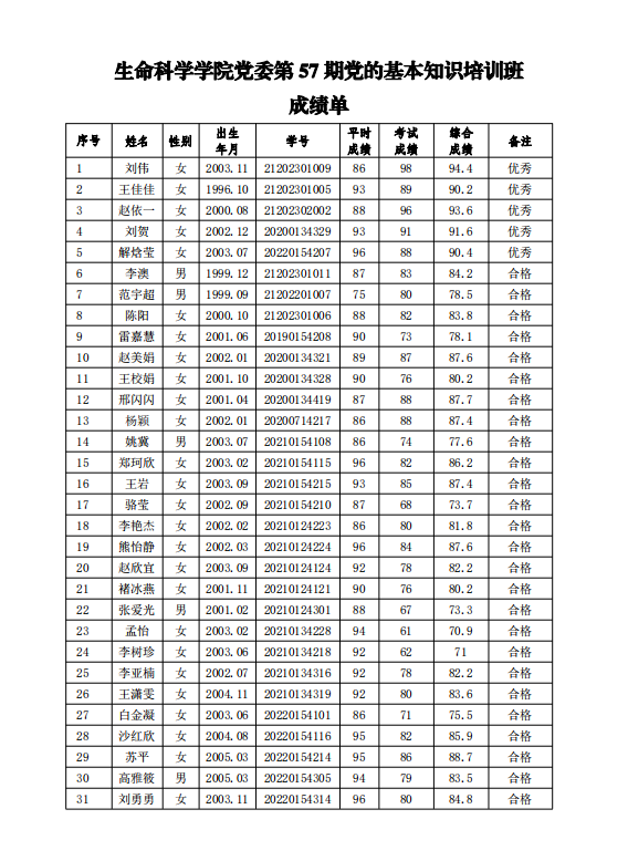91国产 党委第57期党的基本知识培训班共85名,共85人参加本次党的基本知识培训班结业考试,最终79人成绩合格。现将成绩公布如下: