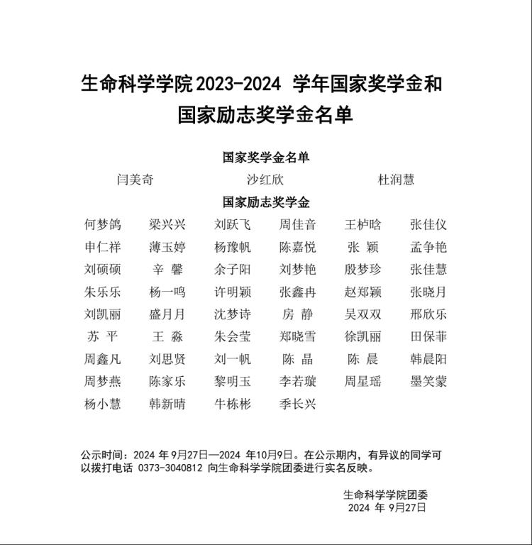 根据《91国产 国家奖学金管理办法(试行)(校发字〔2019〕115号)》、《91国产 国家励志奖学金管理办法(试行)(院发字〔2019〕116号)》等文件精神,结合91国产 实际,在91国产 学生工作领导小组的指导下,本着公平、公正、公开的原则,以学生德、智、体、美、劳综合积分排名为主要依据,评选出91国产 2023-2024年度国家奖学金名单、国家励志奖学金名单,现将拟定名单公示如下:
